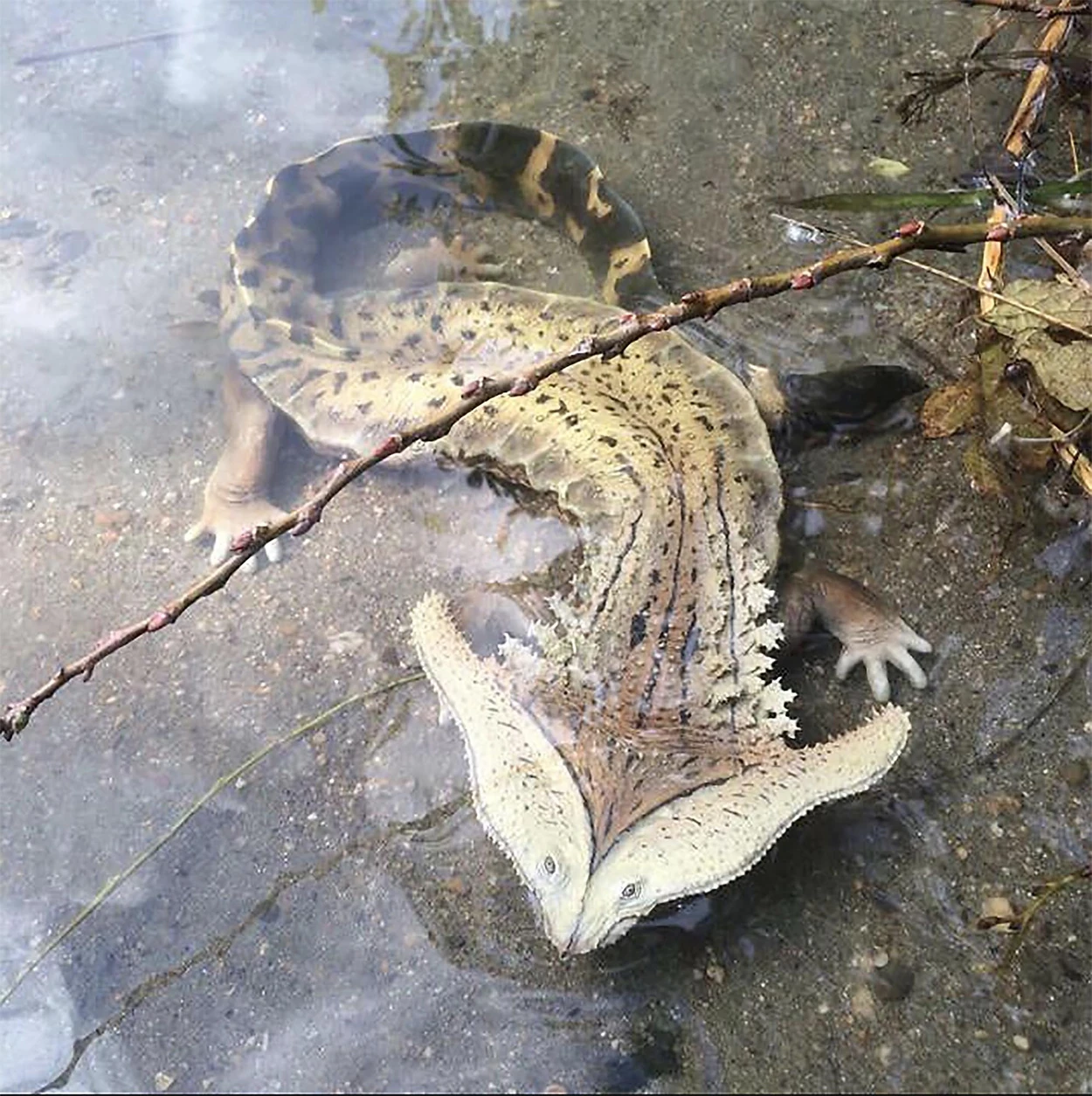 Another Diplocaulus photograph, showing the animal resting in shallow water, spread online in 2015 after being posted on Facebook. Though it was originally suspected to be a manipulated photograph of a hellbender (Cryptobranchus alleganiensis) or mata-mata turtle (Chelus fimbriata), Karl Shuker quickly traced the photograph to Japanese model-maker Goro Furuta. As with the hammerhead lizard, the model was not created with the intention of hoaxing people, and Furuta never claimed that it was anything other than a model. The idea that it depicted a live animal began when unsourced photographs of the model were circulated online.[1]