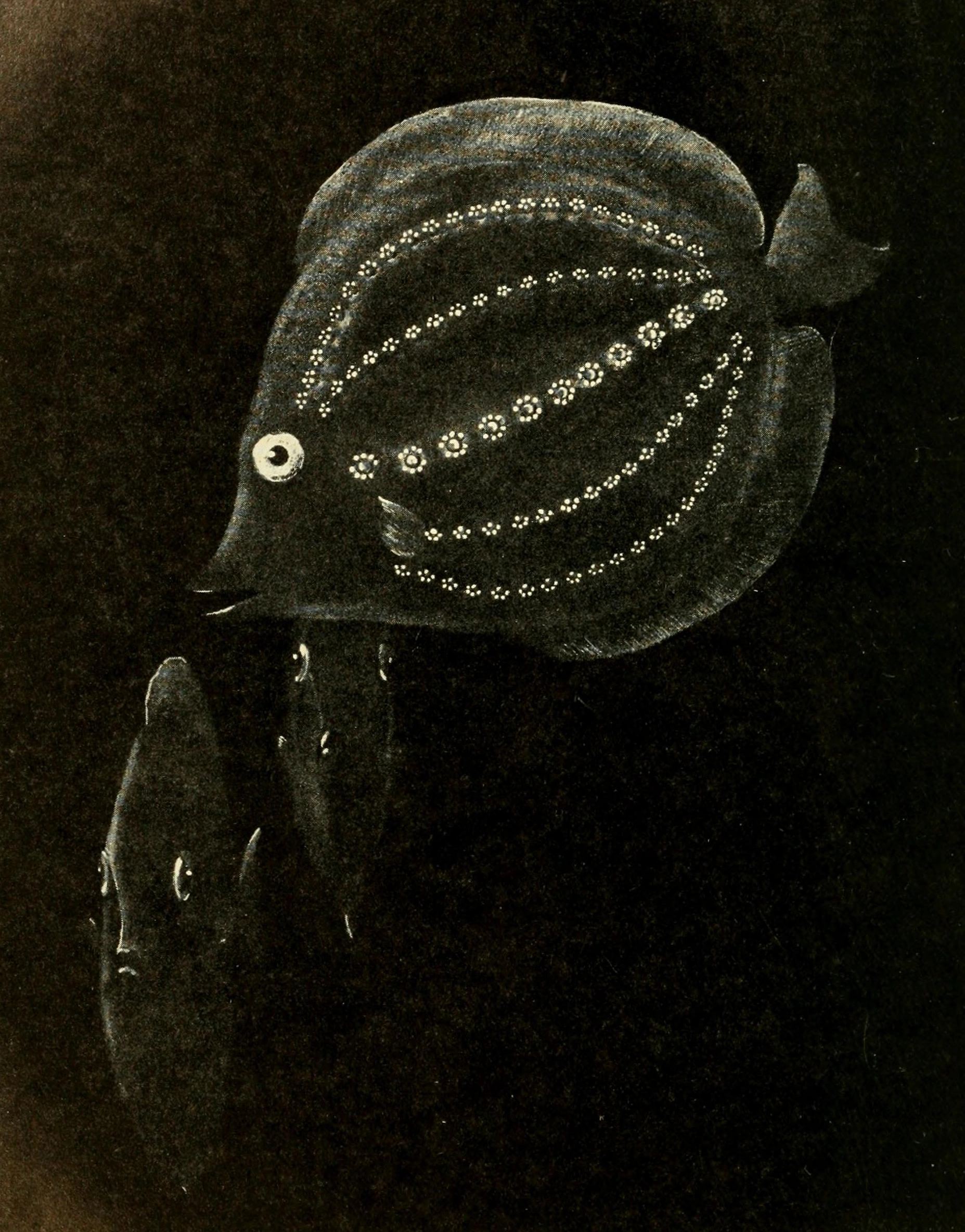 The fish turned slowly and, head on, showed a narrow profile. If It were at the surface and without lights I should, without question, have called it a butterflyfish (Chaetodon) or a surgeonfish (Acanthurus). But this glowing creature was assuredly neither, unless a distant relation, adapted for life at three hundred fathoms. My name for it is Bathysidus pentagrammus, the Five-lined Constellation fish. In my memory it will live throughout the rest of my life as one of the loveliest things I have ever seen. |