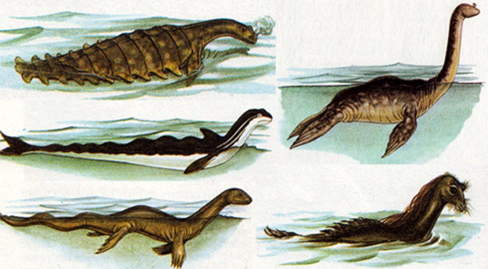 Illustrations of five of Heuvelmans' sea serpent categories from Creatures From Elsewhere (1984). Clockwise from upper left: many-finned sea serpent, long-necked seal, merhorse, super-otter, and many-humped sea serpent.