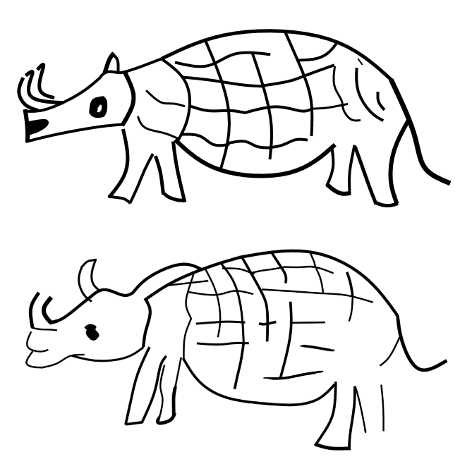 Michel Ballot describes the n'goubou as an animal with a single sharp horn on its head, which is much feared by Baka fishermen.[9] Both types are depicted in Baka illustrations as similar, bulky-bodied, rhinoceros-like quadrupeds with short tails and armoured bodies.[4]