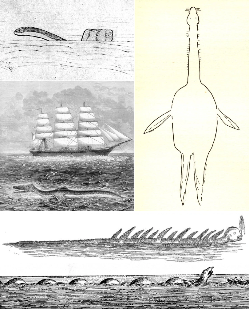 Drawings of various sea serpents by or for alleged eyewitnesses. Clockwise from upper left: the Valhalla sea serpent (1905), the Pentland Firth sea serpent (1919), the Princess sea serpent (1856), Reutz and Tuchsen's sea serpent (1755), and the Sacramento sea serpent (1877).