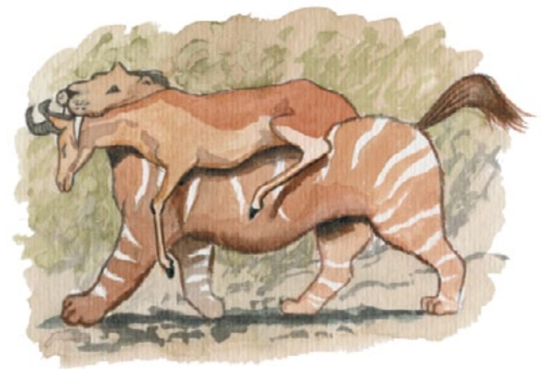 Reconstruction of the African sabre-toothed cat Megantereon with its antelope prey, by Mauricio Antón.